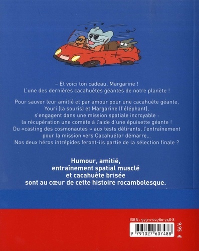 Tome 1 : Au royaume des animaux, Youri, la souris, et Margarine, l'éléphant, sont colocataires et meilleurs amis. Mais un jour, Margarine reçoit un cadeau : l'une des dernières cacahuètes géantes qui existe sur cette planète... Il en tombe immédiatement amoureux ! L'amitié entre souris et éléphant laisse alors place à la jalousie... Une nuit, la cacahuète se brise malencontreusement... Rien ne réconforte Margarine. Sauf peut-être cette affiche qui annonce un "Casting de cosmonautes" pour un voyage vers Cacahuétor, la comète à cacahuètes... Intrépides, les amis se lancent dans l'aventure de cette difficile préparation spatiale ! Un histoire déjantée et désopilante en BD, imaginée et illustrée par Marion Montaigne. Humour, amitié, entraînement spatial musclé et cacahuète brisée sont au coeur de cette histoire rocambolesque.