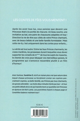 10 000 lectrices déjà conquises ! - Le coup de coeur des blogueuses ! - Adapté et mis en scène pour le théâtre par Trinidad - Un humour frais et décapant pour une réflexion de fond ! Les contes de fées vous mentent ! Après les avoir tous lu, vous pensiez que devenir une Princesse était à la portée de chacune. Un beau sourire, une invitation au bal et une paire de chaussures adaptées et hop ! Direction la vie de rêve aux côtés de votre Prince charmant avec de beaux bébés et une belle-famille formidable ! Mais cette vie la, c'est uniquement dans les contes pour enfants... La vérité est tout autre ! Entre les faux princes charmants, les vraies marâtres, les grossesses durant lesquelles vous devez supporter les conseils de m de tous les sujets du royaume, le chemin de croix pour éduquer vos merveilleux gosses, le programme qui s'annonce ressemble plutôt à un film d'horreur ! Avec humour, Sandrine O. écrit un roman plus vrai que nature dans lequel chaque princesse va forcément croiser ses copines pas-vraiment-copines, sa belle-famille, ses Princes pas tous charmants, ses gosses adorables au moins deux minutes trente par jour et tous ces petits détails de la vie quotidienne qui transforme automatiquement un quotidien de Princesse en épreuve de Koh-Lanta. Les punchlines fusent à chaque page et Cendrillon balance vraiment tout !