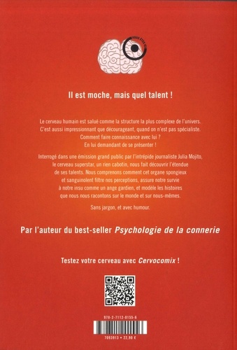Il est moche, mais quel talent ! Le cerveau humain est salué comme la structure la plus complexe de l'univers.. C'est aussi impressionnant que décourageant, quand on n'est pas spécialiste. Comment faire connaissance avec lui ? En lui demandant de se présenter ! Interrogé dans une émission grand public par l'intrépide journaliste Julia Mojito, le cerveau superstar, un rien cabotin, nous fait découvrir l'étendue de ses talents. Nous comprenons comment cet organe spongieux et sanguinolent filtre nos perceptions, assure notre survie à notre insu comme un ange gardien, et modèle les histoires que nous nous racontons sur le monde et sur nous-mêmes. Sans jargon, et avec humour. Par l'auteur du best-seller Psychologie de la connerie Testez votre cerveau avec Cervocomix !