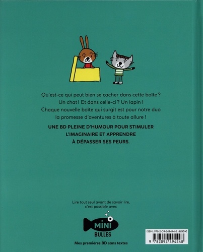Lire tout seul avant de savoir lire, c'est possible avec Mini Bulles. Des premières BD à découvrir dès 3 ans : une BD sans texte conçue pour les petits. Les petits entrent naturellement dans les livres par les images : sans le soutien du texte, les images portent toutes les étapes du récit sans ellipse narrative. Sans texte, chacun est libre de se raconter l'histoire comme il le souhaite : à partir des images, l'enfant passe à l'oral et fait des phrases pour vous raconter l'histoire ou lire tout seul. Dans cette histoire : Qu'est-ce qui se cache dans cette boîte ? Un chat ! Et dans cette boîte ? Un lapin ! Et dans toutes ces autres boîtes, que va-t-on bien pouvoir trouver ? Une aventure pleine d'humour pour apprendre à dépasser ses peurs, à découvrir dès 3 ans. Dans chaque BD, un volet dépliant "Suivez-le guide" pour accompagner les parents et vous donner les clefs d'entrées dans une BD sans texte. Une BD d'Edouard Manceau, auteur et illustrateur français de livres pour enfants.