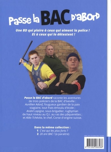 Une BD qui plaira à ceux qui aiment la police ! Et à ceux qui la détestent ! Passe la BAC d'abord raconte les aventures de trois policiers de la BAC d'Ixeville : Aurélien Adonf, fougueux gardien de la paix stagiaire, tout frais émoulu d'école ; André Lapigne, sous-brigadier, rugbyman de haut niveau au Q.I. au ras des pâquerettes ; et Aldo Tchévita, le chef, Corse d'origine suisse.