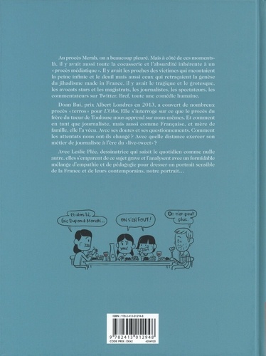 Doan Bui, prix Albert Londres et reporter, et Leslie Plée, chroniqueuse graphique, font le portrait de notre société en racontant le procès Merah. Ses déchirements, ses contradictions, face à ces événements traumatisants. En chroniquant le procès Merah, Doan Bui se questionne sur la parole des victimes et des accusés, le rôle des avocats et des familles, les réponses à donner aux enfants, ou encore son rôle de "live-twitteuse" ... Comment les attentats qui ont secoué la France depuis mars 2012 ont fait bouger la société ? Leslie Plée manie gravité et humour sur un sujet nécessaire. Un livre d'une grande subtilité.