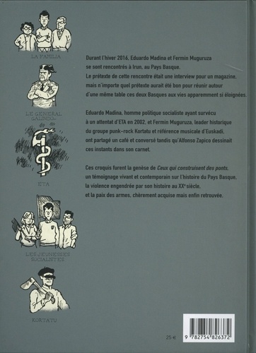 Durant l'hiver 2016. Eduardo Medina et Fermin Muguruza se sont rencontrés à Irun. au Pays Basque. Le prétexte de cette rencontre était une interview pour un magazine mais n'importe quel prétexte aurait été bon pour réunir autour d'une même table ces deux Basques aux vies apparemment si éloignées. Eduardo Medina, homme politique socialiste ayant survécu à un attentat d'ETA en 2002, et Fermin Muguruza, leader historique du groupe punk-rock Kortatu et référence musicale d'Euskadi, ont partagé un café et conversé tandis qu Alfonso Zapico dessinait ces instants dans son carnet. Ces croquis furent la genèse de Ceux qui construisent des ponts, un témoignage vivant et contemporain sur l'histoire du Pays Basque la violence engendrée par son histoire au XXe siècle, et la paix des armes, chèrement acquise mais enfin retrouvée.