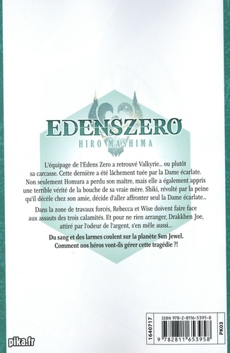L'équipage de l'Edens Zero a retrouvé Valkyrie... ou plutôt sa carcasse. Cette dernière a été lâchement tuée par la Dame écarlate. Non seulement Homura a perdu son maître, mais elle a également appris une terrible vérité de la bouche de sa vraie mère. Shiki, révolté par la peine qu'il décèle chez son amie, décide d'aller affronter seul la Dame écarlate... Dans la zone de travaux forcés, Rebecca et Wise doivent faire face aux assauts des trois calamités. Et pour ne rien arranger, Drakkhen Joe, attiré par l'odeur de l'argent, s'en mêle aussi... Du sang et des larmes coulent sur la planète Sun Jewel. Comment nos héros vont-ils gérer cette tragédie ? !