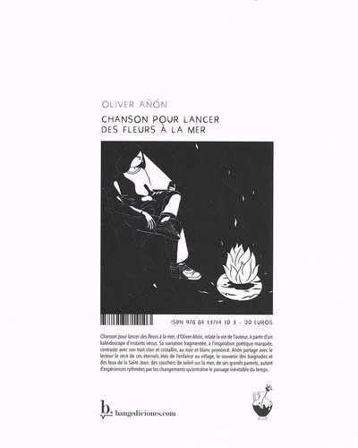 Chanson pour lancer des fleurs à la mer, d'Oliver Anón, relate la vie de l'auteur, à partir d'un kaléidoscope d'instants vécus. Sa narration fragmentée, à l'inspiration poétique marquée, contraste avec son trait clair et cristallin, au noir et blanc prononcé. Anón partage avec le lecteur le récit de ces éternels étés de l'enfance au village, le souvenir des baignades et des feux de la Saint Jean, des couchers de soleil sur la mer, de ses grands-parents, autant d'expériences rythmées par les changements qu'entrain le passage inévitable du temps.