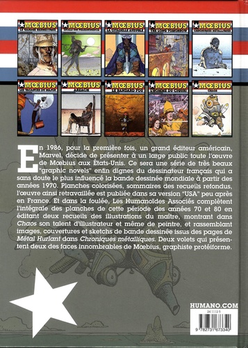 En 1986, pour la première fois, un grand éditeur américain, N Marvel, décide de présenter à un large public toute l'oeuvre de Moebius aux Etats-Unis. Ce sera une série de très beaux «graphic novels» enfin dignes du dessinateur français qui a sans doute le plus influencé la bande dessinée mondiale a partir des années 1970. Planches colorisées, sommaires des recueils refondus, l'oeuvre ainsi retravaillée est publiée dans sa version «USA» peu après en France. Et dans la foulée, Les Humanoïdes Associés complètent l'intégrale des planches de cette période des années 70 et 80 en éditant deux recueils des illustrations du maître, montrant dans Chaos son talent d'illustrateur et même de peintre, et rassemblant images, couvertures et sketchs de bande dessinée issus des pages de Métal Hurlant dans Chroniques métalliques. Deux volets qui présentent deux des faces innombrables de Moebius, graphiste protéiforme.