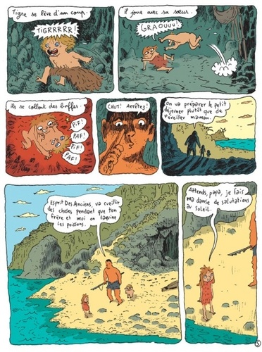 Pot de Miel, sa famille et ses copains vivent dans un décor de rêve au bord de la Méditerranée - sans les touristes, vu que nous sommes en pleine Préhistoire. Il fait beau, la vie est belle, mais Nuit des Câlins en a marre du poisson-manioc. Donc, Pot de Miel et son copain Grand Nez Qui Déniche partent à la chasse. Ce qui leur vaut un tas de rencontres palpitantes : quelques dragons et dinosaures d'époque (ou à peu près), L'Oracle (un condensé de pessimisme), un clan de "civilisés" occupés à sacrifier d'autres "civilisés" un guerrier professionnel qui tient à trucider le monde pour expier ses très grandes fautes et, enfin, des cultivateurs de courgettes. Si bien qu'ils reviendront à la grotte familiale avec des graines et la recette des "petits farcis" (courgettes-opossum) - ce qui constitue un sérieux progrès pour la gastronomie préhistorique. La Vallée des Merveilles, nouvelle série de Joann Sfar (auteur généreux qui s'épanouit mieux dans l'abondance de boulots) nous plonge donc dans le quotidien préhistorique. Résultat : cent pages de gaieté pure, qui mêlent l'aventure (monstres à écailles, bagarres sanglantes, grosses trouilles, sorciers, "costumes" et grigris assortis) et les minuscules événements d'une vie de famille heureuse. Si bien qu'on a dans le même paquet le journal intime, hypersensible, et Conan le Barbare. D'autant plus que le récit est suivi d'un "bonus" passionnant en forme de carnet de bord, où Sfar explore ses sources d'inspiration, nous dévoile quelques babioles techniques - entre autres, la bonne tenue de l'étui pénien de Grand Nez -, et nous livre les dernières nouvelles de Tautmina et Raoul (ses enfants dans la vraie vie), ou les consignes à sa coloriste : "C'est joyeux, c'est l'aventure, le héros a une peau orange". Le tout sous forme de feuilleton à parution annuelle.
