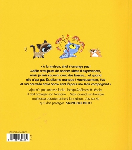 " A la maison, chat s'arrange pas ! Adèle a toujours de bonnes idées d'expériences, mais je finis souvent avec des bosses... et quand Adèle n'est pas là, elle me manque ! Heureusement, Fizz et ma nouvelle amie Snow sont là pour me tenir compagnie ! " Lorsqu'il n'est pas en train de dormir, roupiller ou faire la sieste, Ajax n'a pas une vie facile ! Lorsqu'Adèle, son horrible maîtresse adorée, n'est pas à la maison, il doit protéger son territoire au péril de sa vie ! Mais, quand elle rentre, c'est sa vie qu'il doit protéger... SAUVE QUI PEUT ! © Mr Tan et Diane Le Feyer d'après l'oeuvre créée par Mr Tan et Miss Prickly