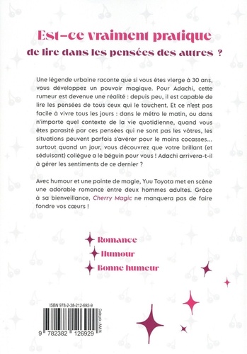 Avec humour et une pointe de magie, Yuu Toyota met en scène une adorable romance entre deux hommes adultes. Grâce à sa bienveillance, Cherry Magic ne manquera pas de faire fondre vos coeurs ! La légende urbaine raconte que si vous êtes vierge à 30 ans, vous développez un pouvoir magique. Pour Adachi, cette rumeur est devenue une réalité : depuis peu, il peut lire les pensées de tous ceux qui le touchent. Et ce n'est pas facile à vivre tous les jours : dans le métro le matin, ou dans n'importe quel contexte de la vie quotidienne, quand vous êtes parasités par ces pensées qui ne sont pas les vôtres, les situations peuvent s'avérer parfois pour le moins cocasses. Surtout quand un jour, vous découvrez que votre brillant (et séduisant) collègue a le béguin pour vous ! Adachi arrivera-t-il à gérer les sentiments de ce dernier ?