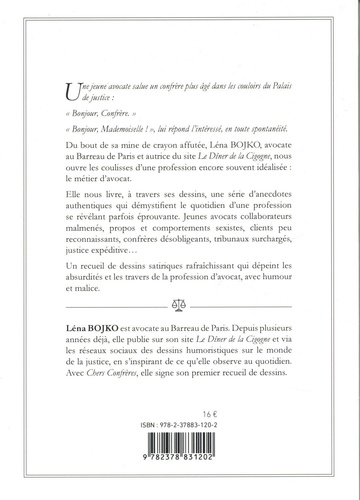 Une jeune avocate salue un confrère plus âgé dans les couloirs du Palais de justice : "Bonjour, Confrère." "Bonjour, Mademoiselle ! ", lui répond l'intéressé, en toute spontanéité. Du bout de sa mine de crayon affutée, Léna Bojko, avocate au Barreau de Paris et autrice du site Le Dîner de la Cigogne, nous ouvre les coulisses d'une profession encore souvent idéalisée : le métier d'avocat. Elle nous livre, à travers ses dessins, une série d'anecdotes authentiques qui démystifient le quotidien d'une profession se révélant parfois éprouvante. Jeunes avocats collaborateurs malmenés, propos et comportements sexistes, clients peu reconnaissants, confrères désobligeants, tribunaux surchargés, justice expéditive... Un recueil de dessins satiriques rafraîchissant qui dépeint les absurdités et les travers de la profession d'avocat, avec humour et malice.