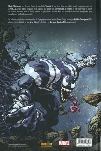Ce volume compile les treize épisodes de l'épopée cosmique Venom : Agent du Cosmos (Venom : Space Knight en VO), écrite par Robbie Thompson (Silk) et superbement illustrée par Ariel Olivetti (Punisher) et Gerardo Sandoval (New Avengers). Flash Thompson est devenu l'hôte du symbiote Venom. Grâce à lui, l'ancien soldat a opéré comme agent du S. H. I. E. L. D. , avant d'être propulsé dans l'espace aux côtés des Gardiens de la Galaxie. Il est désormais un agent du cosmos, oeuvrant pour la paix à travers la galaxie tout entière. Mais ses premières missions se révèlent plus compliquées qu'il ne l'avait prévu. Cet album contient les épisodes 1 à 13 de Venom : Space Knight (2016).