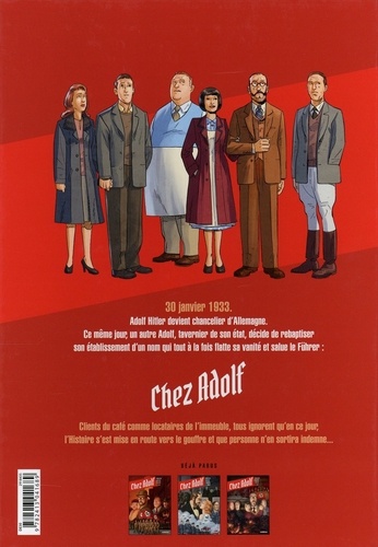Qu'aurions-nous fait à partir de 1933 si nous avions été Allemands ? En suivant le parcours des habitants d'un immeuble dans une ville d'Allemagne, Chez Adolf raconte la montée du nazisme et ses dégâts irréversibles. La vie n'est plus que restrictions, inquiétudes et ruines. La solidarité s'organise. Les mieux lotis viennent en aide aux plus démunis et ceux qui le peuvent, hébergent les malheureux jetés à la rue par la guerre. Ainsi Karl accueille chez lui Mona, privée de tout. Une histoire va naitre de cette situation mais les temps ne sont pas propices aux idylles.