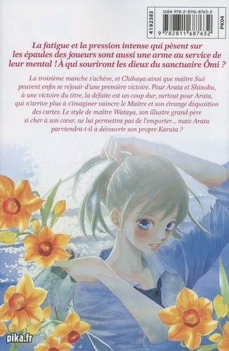 La fatigue et la pression intense qui pèsent sur les épaules des joueurs sont aussi une arme au service de leur mental ! A qui souriront les dieux du sanctuaire Omi ? La troisième manche s'achève, et Chihaya ainsi que maître Suô peuvent enfin se réjouir d'une première victoire. Pour Arata et Shinobu, à une victoire du titre, la défaite est un coup dur, surtout pour Arata, qui n'arrive plus à s'imaginer vaincre le Maître et son étrange disposition des cartes. Le style de maître Wataya, son illustre grand-père si cher à son coeur, ne lui permettra pas de l'emporter... mais Arata parviendra-t-il à découvrir son propre Karuta ?