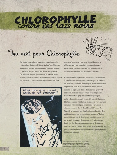 Quand la poésie d'une série animalière rencontre le grand frisson de l'Aventure... Ce 1er volume de l’intégrale reprend les toutes premières aventures de Chlorophylle le lérot et de son ami le souriceau Minimum, avec lequel il lutte contre le redoutable Anthracite, chefs des rats noirs. Ce dernier, assoiffé de pouvoir, est prêt à tout pour éliminer Chlorophylle qui l’empêche d’envahir le Val-Tranquille. Ces 1ers récits révèlent déjà toute la richesse de l’oeuvre de Macherot, avec des épisodes champêtres, une histoire policière et même du fantastique. Redécouvrez enfin dans une version de qualité ce grand classique de la BD belge et du journal "Tintin" !