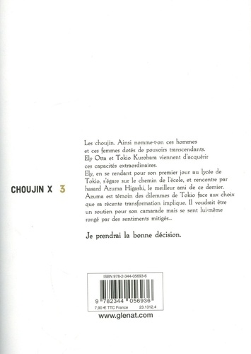 Je prendrai la bonne décision. Les choujin. Ainsi nomme-t-on ces hommes et ces femmes dotés de pouvoirs transcendants. La jeune Ely Otta et le lycéen Tokio Kurohara viennent d'acquérir ces capacités extraordinaires. Ely a déménagé dans la préfecture de Tokio. Alors qu'elle s'est égarée sur le chemin de l'école, elle rencontre- par hasard Azuma Higashi, le meilleur ami de Tokio. Azuma est témoin des dilemmes de Tokio face aux choix que sa récente transformation implique. Il voudrait être un soutien pour son camarade mais se sent lui-même rongé par des sentiments mitigés...
