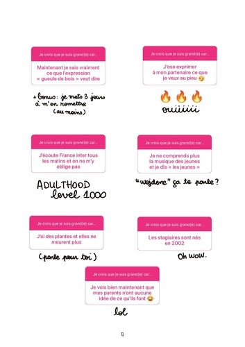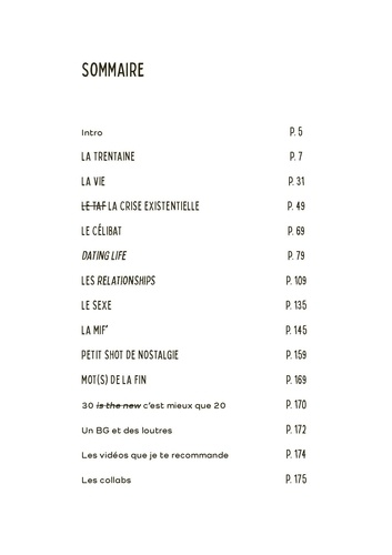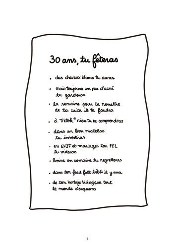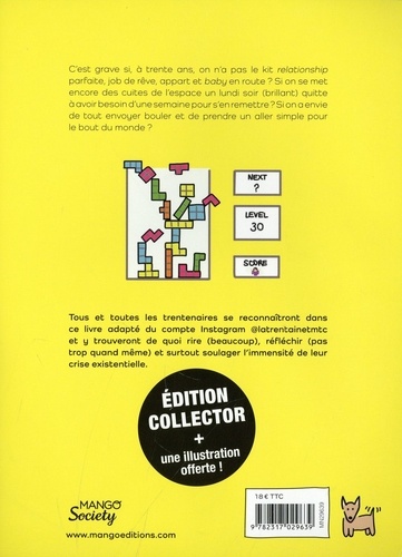 C'est grave si, à trente ans, on n'a pas le kit relationship parfaite, job de rêve, appart et baby en route ? Si on se met encore des cuites de l'espace un lundi soir (brillant) quitte à avoir besoin d'une semaine pour s'en remettre ? Si on a envie de tout envoyer bouler et de prendre un aller simple pour le bout du monde ? Tous et toutes les trentenaires se reconnaîtront dans ce livre adapté du compte Instagram @latrentainetmtc et y trouveront de quoi rire (beaucoup), réfléchir (pas trop quand même) et surtout soulager l'immensité de leur crise existentielle.