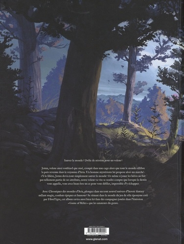 Sauver le monde ? Drôle de mission pour un voleur ! Jotun, voleur aussi roublard que rusé, croupit dans une cage alors que tout le monde célébrè la paix revenue dans le royaume d'Aria. Un homme mystérieux lui propose alors un marché : s'il le libère, Jotun devra tout simplement sauver le monde ! Et même si jouer les héros ne fait pas tellement partie de ses attributs, notre voleur va vite se rendre compte que lorsque le destin vous appelle, vous avez beau être un as pour vous défiler, impossible d'y échapper. Avec Chroniques des mondes d'Aria, plongez dans un tut nouvel univers d'hernie fantasy mêlant magie, combats épiques et humour Se situant dans le monde du jeu de rôle éponyme créé par FibreTigre, cet album ravira aussi bien les fans des campagnes jouées dans l'émission Game of Rôles. que les amateurs du genre.