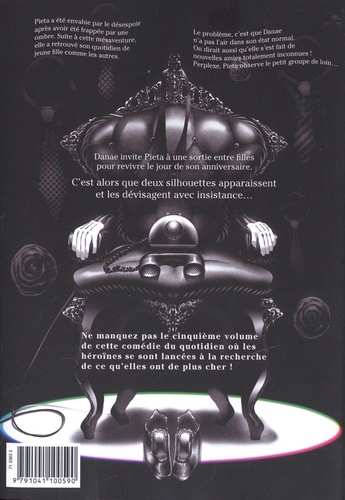 Des jeunes filles se battent pour briser le cycle du temps et connaître enfin le lendemain ! Pieta a été envahie par le désespoir après avoir été frappée par une ombre. Suite à cette mésaventure, elle a retrouvé son quotidien de jeune fille comme les autres. Le problème, c'est que Danae n'a pas l'air dans son état normal. On dirait aussi qu'elle s'est fait de nouvelles amies totalement inconnues ! Perplexe, Pieta observe le petit groupe de loin... Danae invite Pieta à une sortie entre filles pour revivre le jour de son anniversaire. C'est alors que deux silhouettes apparaissent et les dévisagent avec insistance... Ne manquez pas le cinquième volume de cette comédie du quotidien où les héroïnes se sont lancées à la recherche de ce qu'elles ont de plus cher !