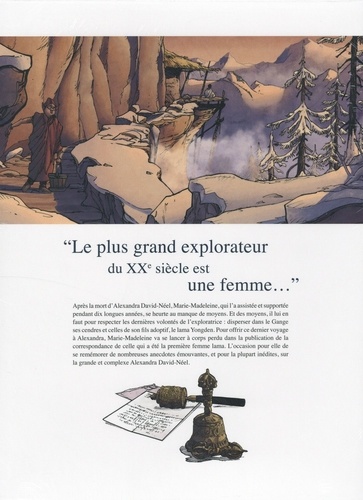 "Le plus grand explorateur du XXe siècle est une femme..." Après la mort d'Alexandra David-Néel, Marie-Madeleine, qui l'a assistée et supportée pendant dix longues années, se heurte au manque de moyens. Et des moyens, il lui en faut pour respecter les dernières volontés de l'exploratrice : disperser dans le Gange ses cendres et celles de son fils adoptif, le lama Yongden. Pour offrir ce dernier voyage il Alexandra, Marie-Madeleine va se lancer à corps perdu dans la publication de la correspondance de celle qui a été la première femme lama. L'occasion pour elle de se remémorer de nombreuses anecdotes émouvantes, et pour la plupart inédites, sur la grande et complexe Alexandra David-Néel.