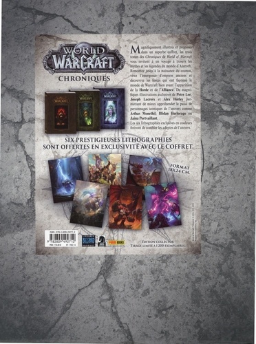 Ce coffret contenant les trois tomes des Chroniques de World of Warcraft vous invite à un voyage à travers les mythes et les légendes du monde d'Azeroth. Remontez jusqu'à la naissance du cosmos, vivez l'émergence d'empires anciens et découvrez les forces qui ont façonné le monde de Warcraft bien avant l'apparition de la Horde et de l'Alliance. De magnifiques illustrations exclusives de Peter Lee, Joseph Lacroix et Alex Horley permettent aussi de mieux appréhender le passé de personnages iconiques de l'univers comme Arthas Menethil, Ilidan Hurlorage ou Jaina Portvaillant. Magnifiquement illustrés et proposés dans un superbe coffret, ces romans offrent des dessins exclusifs, ainsi que des cartes montrant les évolutions d'Azeroth à travers le temps. Les trois lithographies exclusives finiront de combler les adeptes de l'univers.