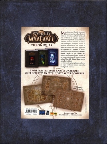 Magnifiquement illustrés et proposés dans un superbe coffret, les trois tomes des Chroniques de World of Warcraft vous invitent à un voyage à travers les mythes et les légendes du monde d'Azeroth. Remontez jusqu'à la naissance du cosmos, vivez l'émergence d'empires anciens et découvrez les forces qui ont façonné le monde de Warcraft bien avant l'apparition de la Horde et de l'Alliance. De magnifiques illustrations exclusives de Peter Lee, Joseph Lacroix et Alex Horley permettent de mieux appréhender le passé de personnages iconiques de l'univers comme Arthas Menethil, Illidan Hurlorage ou Jaina Portvaillant. Les trois cartes géographiques exclusives sur papier parcheminé finiront de combler les adeptes de l'univers.