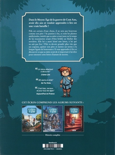 Dans le Moyen Age de la guerre de Cent Ans, avoir dix ans et vouloir apprendre à lire est une vraie bataille ! Piik est certain d'une chose, il ne sera pas bourreau comme son père ! Sa passion à lui, ce sont les plantes médicinales, intérêt que sa mère a tout juste eu le temps de lui transmettre avant d'être brûlée au bûcher des sorcières. Elle lui a aussi laissé une lettre, à lui qui ne sait pas lire ! Piik va devoir grandir plus vite que ses copains, quitter son père et mettre un terme à la longue lignée de bourreaux s'il veut apprendre à lire et découvrir ce que sa mère avait de si important à lui dire pour entourer cette lettre d'autant de secrets.