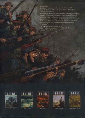 Ils sont huit. Huit jeunes hommes sur le point de devenir soldats. En août 1914, mobilisés, ils quittent leur village pour rejoindre la frontière. Ils laissent derrière eux leurs épouses, leurs enfants et leurs familles, et découvrent la guerre. Confrontés à l'absurde réalité du front, ces huit garçons ignorent encore qu'ils s'apprêtent à vivre cinq années de brutalité et de sauvagerie. Ils devront affronter les bombes, le climat, les privations, la boue, la peur et l'aveuglement de leur hiérarchie. Et la mort. Car certains ne reviendront pas. Dans l'enfer des tranchées, 14-18 tisse le destin tragique de ces huit "petits soldats".