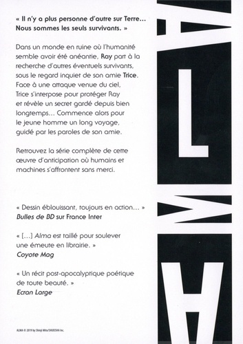 Dans un monde en ruine où l'humanité semble avoir été anéantie, Ray part à la recherche d'autres éventuels survivants, sous le regard inquiet de son amie Trice. Face à une attaque venue du ciel, Trice s'interpose pour protéger Ray et révèle un secret gardé depuis bien longtemps... Commence alors pour le jeune homme un long voyage guidé par les paroles de son amie. Et voilà un autre coffret pour les fêtes de fin d'année regroupant l'intégrale de la série Alma. L'occasion parfaite pour découvrir cette courte et captivante série de science-fiction. En 2015, Shinji Mito a remporté le prix du jeune talent Quatre saisons du magazine Afternoon (publié aux éditions Kodansha) pour son one shot Allegro. Après une histoire courte en 2016, il imagine les deux tomes de Dareka no sekai puis se consacre à Alma prépublié dans le Weekly Young Jump entre 2019 et 2020. Dans cette oeuvre d'anticipation où humains et machines s'affrontent sans merci, Shinji Mito fait cohabiter cet univers SF post apocalyptique avec le monde intérieur très poétique, et teinté d'humour, du héros. A souligner : les dessins incroyables du mangaka.