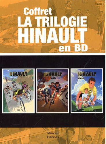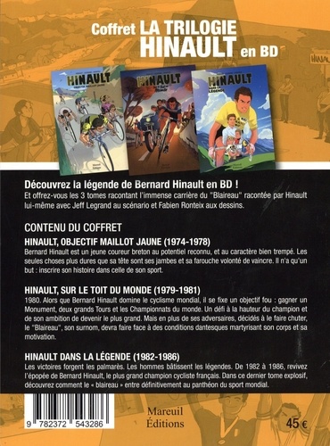 Découvrez la légende de Bernard Hinault en BD ! Et offrez-vous les 3 tomes racontant l'immense carrière du "Blaireau" racontée par Hinault lui-même avec Jeff Legrand au scenario et Fabien Ronteix aux dessins. CONTENU DU COFFRET HINAULT, OBJECTIF MAILLOT JAUNE (1974-1978) Bernard Hinault est un jeune coureur breton au potentiel reconnu, et au caractère bien trempé. Les seules choses plus dures que sa tête sont ses jambes et sa farouche volonté de vaincre. Il n'a qu'un but : inscrire son histoire dans celle de son sport. HINAULT, SUR LE TOIT DU MONDE (1979-1981) 1980. Alors que Bernard Hinault domine le cyclisme mondial, il se fixe un objectif fou : gagner un Monument, deux grands Tours et les Championnats du monde. Un défi à la hauteur du champion et de son ambition de devenir le plus grand. Mais en plus de ses adversaires, décidés à le faire chuter, le "Blaireau", son surnom, devra faire face à des conditions dantesques martyrisant son corps et sa motivation. HINAULT DANS LA LEGENDE (1982-1986) Les victoires forgent les palmarès. Les hommes bâtissent les légendes. De 1902 à 1980, revivez l'épopée de Bernard Hinault, le plus grand champion cycliste français. Dans ce dernier tome explosif, découvrez comment le " blaireau " entre définitivement au panthéon du sport mondial.