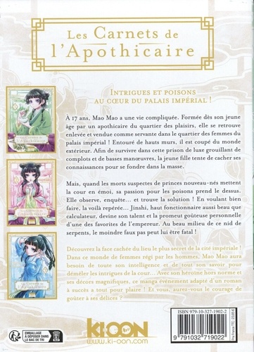 A 17 ans, Mao Mao a une vie compliquée. Formée dès son jeune âge par un apothicaire du quartier des plaisirs, elle se retrouve enlevée et vendue comme servante dans le quartier des femmes du palais impérial ! Entouré de hauts murs, il est coupé du monde extérieur. Afin de survivre dans cette prison de luxe grouillant de complots et de basses manoeuvres, la jeune fille tente de cacher ses connaissances pour se fondre dans la masse. Mais, quand les morts suspectes de princes nouveau-nés mettent la cour en émoi, sa passion pour les poisons prend le dessus. Elle observe, enquête... et trouve la solution ! En voulant bien faire, la voilà repérée... Jinshi, haut fonctionnaire aussi beau que calculateur, devine son talent et la promeut goûteuse personnelle d'une des favorites de l'empereur. Au beau milieu de ce nid de serpents, le moindre faux pas peut lui être fatal ! Découvrez la face cachée du lieu le plus secret de la cité impériale ! Dans ce monde de femmes régi par les hommes, Mao Mao aura besoin de toute son intelligence et de tout son savoir pour démêler les intrigues de la cour... Avec son héroïne hors norme et ses décors magnifiques, ce manga événement adapté d'un roman à succès a tout pour plaire ! Et vous, aurez-vous le courage de goûter à ses délices ?