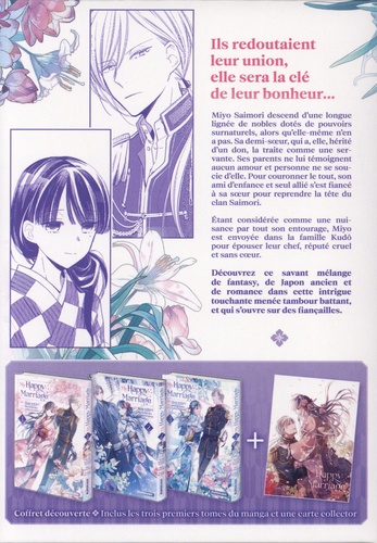 Ils redoutaient leur union, elle sera la clé de leur bonheur... Ils redoutaient leur union, elle sera la clé de leur bonheur... Miyo Saimori descend d'une longue lignée de nobles dotés de pouvoirs surnaturels, alors qu'elle-même n'en a pas. Sa demi-soeur, qui a, elle, hérité d'un don, la traite comme une servante. Ses parents ne lui témoignent aucun amour et personne ne se soucie d'elle. Pour couronner le tout, son ami d'enfance et seul allié s'est fiancé à sa soeur pour reprendre la tête du clan Saimori. Etant considérée comme une nuisance par tout son entourage, Miyo est envoyée dans la famille Kudô pour épouser leur chef, réputé cruel et sans coeur. Découvrez ce savant mélange de fantasy, de Japon ancien et de romance dans cette intrigue touchante menée tambour battant, et qui s'ouvre sur des fiançailles.