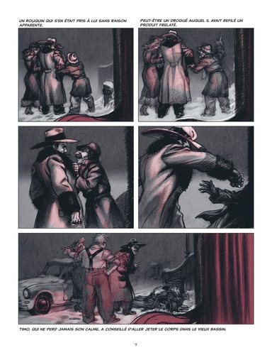 Frank est le fils de Lotte, tenancière de la maison close que fréquentent les forces d'occupation de cette ville moyenne d'Europe de l'Est jamais nommée, figée dans les pénuries, le froid et la sourde horreur des années de guerre. Il a 17 ans et les filles n'ont plus de secrets pour lui, puisqu'il a les pensionnaires de sa mère à disposition. Sans savoir ce qu'il cherche, Frank se laisse glisser sur la pente du banditisme, assassine, sans raison matérielle ni patriotique, un occupant particulièrement répugnant, vole et tue une vieille femme qu'il connaît depuis l'enfance, et plonge dans un avilissement que seule éclaire l'image idéalisée de Sissy, sa chaste voisine, éperdument amoureuse de lui. La déchéance volontaire peut-elle conduire à la rédemption ? C'est la question lancinante que soulève La neige était sale, le grand roman existentialiste de Georges Simenon, adapté avec brio par Jean-Luc Fromental et Bernard Yslaire.