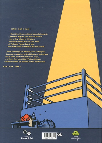 Han ! Han ! Han ! C'est bien. On va continuer les enchaînements par deux. Miguel, Yuri, Fidel et Esteban sur le ring. Miguel et Esteban, vous vous mettez dans un coin, Fidel et Yuri dans l'autre. Tour à tour, vous allez boxer en défense, dos aux cordes. Voilà, comme ça. Tu défends, Yuri. Tu bloques, tu pares, tu esquives et toi, Fidel, tu ne lâches pas. Vas-y, Fidel, varie les hauteurs au corps, à la face ! Très bien, Fidel ! Tu l'as débordé. Continue comme ça, mais ne lui fais pas trop mal. Paf ! Paf ! Paf !