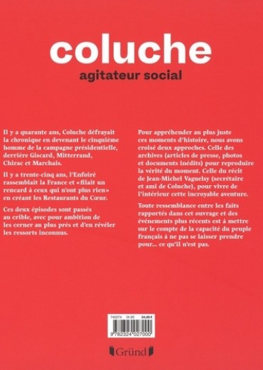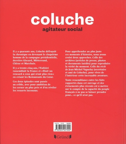 Coluche, agitateur social Il y a quarante ans, Coluche défrayait la chronique en devenant le cinquième homme de la campagne présidentielle, derrière Giscard, Mitterrand, Chirac et Marchais. Il y a trente-cinq ans, l'Enfoiré rassemblait la France et " filait un rencard à ceux qui n'ont plus rien " en créant les Restaurants du Coeur. Ces deux épisodes sont passés au crible, avec pour ambition de les cerner au plus près et d'en révéler les ressorts inconnus. Pour appréhender au plus juste ces moments d'histoire, nous avons croisé deux approches. Celle des archives (articles de presse, photos et documents inédits) pour reproduire la vérité du moment. Celle du récit de Jean-Michel Vaguelsy (secrétaire et ami de Coluche), pour vivre de l'intérieur cette incroyable aventure. Toute ressemblance entre les faits rapportés dans cet ouvrage et des événements plus récents est à mettre sur le compte de la capacité du peuple français à ne pas se laisser prendre pour... ce qu'il n'est pas.