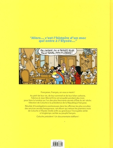 Françaises, Français, on vous a menti ! Au péril de leur vie, de leur sommeil et de leur bilan carbone, Fabrice et Jean-Marcel Erre ont enquêté pendant des mois pour faire la lumière sur l'un des plus fascinants secrets d'Etat du XXe siècle : l'élection de Coluche à la présidence de la République française. Résultat d'investigations aventureuses dans les officines les plus occultes des services secrets hexagonaux, cet album qui retrace les premiers mois de Coluche à l'Elysée révèle enfin au grand jour l'incroyable vérité si longtemps cachée au peuple français. Coluche président ! Un documentaire édifiant !