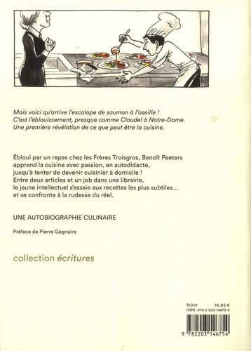 Entre 18 et 25 ans, la cuisine a tenu une place immense dans la vie de Benoît Peeters. Après un repas chez les Frères Troisgros à Roanne, alors le restaurant le plus célèbre de France, le jeune homme apprend la cuisine avec passion, en autodidacte. Quand il laisse tomber la préparation du concours de Normale Sup et que ses parents lui coupent les vivres, Benoît tente de devenir cuisinier à domicile ! Entre deux articles et un job dans une librairie, il s'essaie aux recettes les plus subtiles... et se confronte à la rudesse du réel.