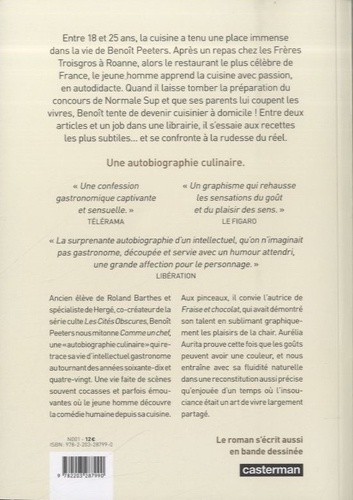 Entre 18 et 25 ans, la cuisine a tenu une place immense dans la vie de Benoît Peeters. Après un repas chez les Frères Troisgros à Roanne, alors le restaurant le plus célèbre de France, le jeune homme apprend la cuisine avec passion, en autodidacte. Quand il laisse tomber la préparation du concours de Normale Sup et que ses parents lui coupent les vivres, Benoît tente de devenir cuisinier à domicile ! Entre deux articles et un job dans une librairie, il s'essaie aux recettes les plus subtiles... et se confronte à la rudesse du réel.