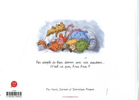 Six doudous, c'est beaucoup ! Et quand arrive l'heure de se coucher, pas simple de trouver sa place dans le lit. D'autant que tous les doudous aimeraient dormir à côté de Ana Ana. Mais entre le sommeil agité de Baleineau, les grandes oreilles de Zigzag, et les pattes glacées de Pingpong... Comment faire pour contenter tout le monde, tout en permettant à chacun de bien dormir ? Ana Ana n'est jamais longtemps à court d'idées et, grâce au concours de tous les doudous, ils sauront trouver ensemble leur équilibre et passer ainsi une jolie nuit.