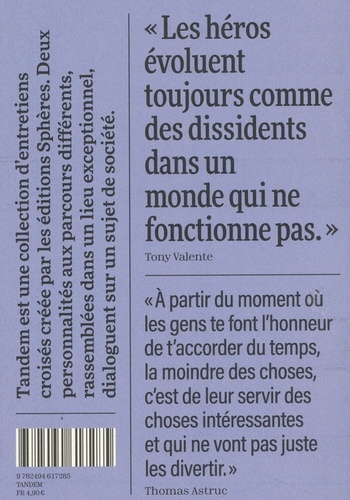 " Les héros évoluent toujours comme des dissidents dans un monde qui ne fonctionne pas. " Tony Valente "A partir du moment où les gens te font l'honneur de t'accorder du temps, la moindre des choses, c'est de leur servir des choses intéressantes et qui ne vont pas juste les divertir." Thomas Astruc i i 9782499 61"28- TANDEM e
