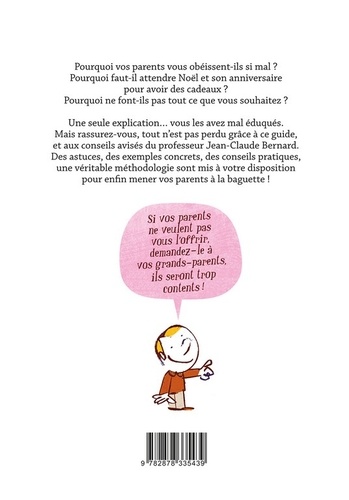 Pourquoi vos parents vous obéissent-ils si mal ? Pourquoi faut-il attendre Noël et son anniversaire pour avoir des cadeaux ? Pourquoi ne font-ils pas tout ce que vous souhaitez ? Une seule explication... vous les avez mal éduqués. Mais rassurez-vous, tout n'est pas perdu grâce à ce guide, et aux conseils avisés du professeur Jean-Claude Bernard. Des astuces, des exemples concrets, des conseils pratiques, une véritable méthodologie sont mis à votre disposition pour enfin mener vos parents à la baguette ! Si vos parents ne veulent pas vous l'offrir, demandez-le à vos grands-parents, ils seront trop contents !