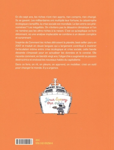 Feuilleter un extrait. (Lien -> https : //www. calameo. com/read/005979625f30c3b8d2d63) En dix-sept ans, les riches n'ont rien appris, rien compris, rien changé. Ils se gavent. Les milliardaires ont multiplié leur fortune, la catastrophe écologique s'amplifie, la crise sociale est mondiale. Le lien entre ces phénomènes ? Les inégalités. On n'évitera pas le désastre climatique si l'on ne ramène pas les ultra-riches à la raison. C'est ce qu'explique ce livre détonnant, où une analyse implacable se combine à un dessin complice et surprenant. Inspirée de Comment les riches détruisent la planète , best-seller paru en 2007 et traduit en douze langues qui a largement contribué à montrer l'articulation intime entre crise écologique et crise sociale, cette bande dessinée s'imposait pour en actualiser les données et le constat. Elle raconte comment, en bientôt vingt ans, l'oligarchie a augmenté sa passion destructrice et endossé les nouveaux habits du capitalisme. Dans ce livre, on rit, on pleure, on apprend, on mobilise : c'est un outil pour changer le monde. Il y a urgence.