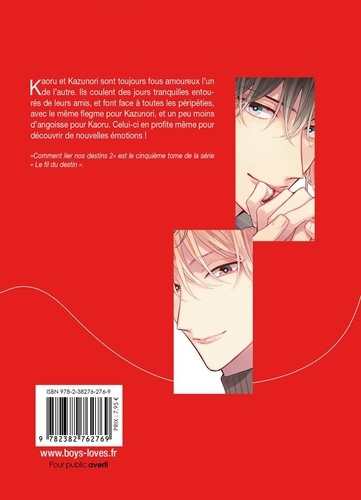 Kaoru et Kazunori sont toujours fous amoureux l'un de l'autre. Ils coulent des jours tranquilles entourés de leurs amis, et font face à toutes les péripéties, avec le même flegme pour Kazunori, et un peu moins d'angoisse pour Kaoru. Celui-ci en profite même pour découvrir de nouvelles émotions ! "Comment lier nos destins 2" est le cinquième tome de la série " Le fil du destin ".