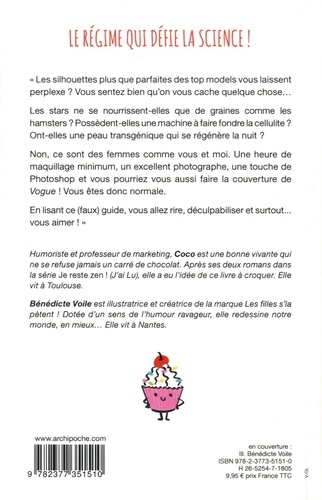 "Les silhouettes plus que parfaites des top models vous laissent perplexe ? Vous sentez bien qu'on vous cache quelque chose... Les stars ne se nourrissent-elles que de graines comme les hamsters ? Possèdent-elles une machine à faire fondre la cellulite ? Ont-elles une peau transgénique qui se régénère la nuit ? Non, ce sont des femmes comme vous et moi. Une heure de maquillage minimum, un excellent photographe, une touche de Photoshop et vous pourriez vous aussi faire la couverture de Vogue ! Vous êtes donc normale. En lisant ce (faux) guide, vous allez rire, déculpabiliser et surtout... vous aimer !"