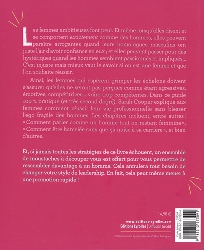 Les femmes ambitieuses font peur. Et même lorsqu'elles disent et se comportent exactement comme des hommes, elles peuvent paraître arrogantes quand leurs homologues masculins ont juste l'air d'avoir confiance en eux ; et elles peuvent passer pour des hystériques quand les hommes semblent passionnés et impliqués... C'est injuste .mais mieux vaut le savoir si on est une femme et que l'on souhaite réussir. Ainsi, les femmes qui espèrent grimper les échelons doivent s'assurer qu'elles ne seront pas perçues comme étant agressives, émotives, compétitrices... voire trop compétentes. Dans ce guide 100% pratique (et très second degré), Sarah Cooper explique aux femmes comment réussir leur vie professionnelle sans blesser l'ego fragile des hommes. Les chapitres incluent, entre autres : "Comment parler comme un homme tout en restant féminine", "Comment être harcelée sans que ça nuise à sa carrière", et bien d'autres. Et, si jamais toutes les stratégies de ce livre échouent, un ensemble de moustaches à découper vous est offert pour vous permettre de ressembler davantage à un homme. Cela annulera tout besoin de changer votre style de leadership. En fait, cela peut même mener à une promotion rapide !