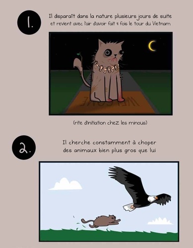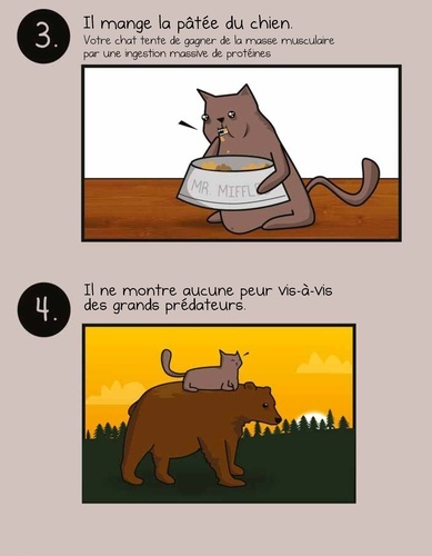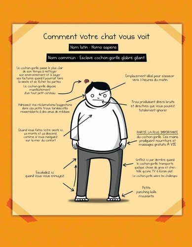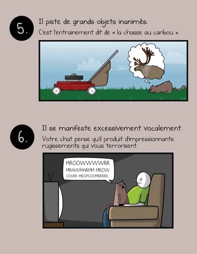 Astucieusement fantaisiste et bizarrement instructif, theoatmeal.com est un site américain extrêmement populaire qui propose des bandes dessinées, des quizz et des histoires. Lancé en juillet 2009, il bénéficie aujourd'hui de plus de 4 millions de visiteurs par mois. Cet engouement lui a même valu d'être élu meilleur blog 2010 par le Times ! Après le succès mondial de son premier ouvrage, 5 bonnes raisons de mettre une droite à un dauphin, publié en novembre 2011 aux éditions 12 BIS, The Oatmeal nous propose de nous pencher sur nos chats. Ainsi, grâce à ce nouvel opus, vous apprendrez à caresser Minou, à savoir comment agir lorsqu'un sandwich au thon se trouve dans la même pièce que votre sympathique boule de poils et vous, ou encore à savoir s'il cherche à vous tuer... Car ces adorables créatures qui nous amusent avec leurs mignonnes petites mimiques, nous attendrissent avec leurs grands yeux doux, nous accompagnent au jour le jour n'ont qu'un seul but : devenir les maîtres du monde. Eh oui, ne soyez pas dupes !