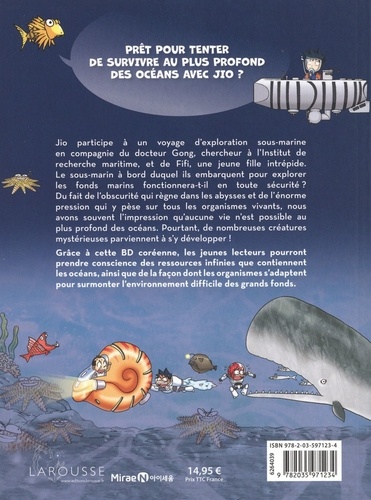 Jio participe à un voyage d'exploration sous-marine en compagnie du docteur Gong, chercheur à l'Institut de recherche maritime, et de Fifi, une jeune fille intrépide. Le sous-marin dans lequel ils embarquent pour explorer les fonds marins fonctionnera-t-il en toute sécurité ? Du fait de l'obscurité qui règne dans les abysses et de l'énorme pression qui y pèsent sur tous les organismes vivants, nous avons souvent l'impression qu'aucune vie n'est possible au plus profond des océans. Pourtant, de nombreuses créatures mystérieuses parviennent à s'y développer ! Grâce à cette BD coréenne, les jeunes lecteurs pourront prendre conscience des ressources infinies que contiennent les océans, ainsi que de la façon dont les organismes s'adaptent pour surmonter l'environnement difficile des grands fonds.