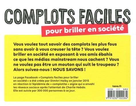 Vous voulez tout savoir des complots les plus fous sans avoir à vous creuser la tête ? Vous voulez briller en société en exposant à vos amis ébahis ce que les médias mainstream nous cachent ? Vous ne voulez pas être un mouton qui suit le troupeau ? Alors suivez nous ! NOUS SAVONS ! La page Facebook "Complots faciles pour briller en société" a été créée par Dimitri Halby en Janvier 2015 en réaction à l'épidémie de complotite aigüe qui a envahi les réseaux sociaux après l'attentat de Charlie Hebdo. Elle est suivie par 300 000 personnes au moment de la sortie de ce livre.