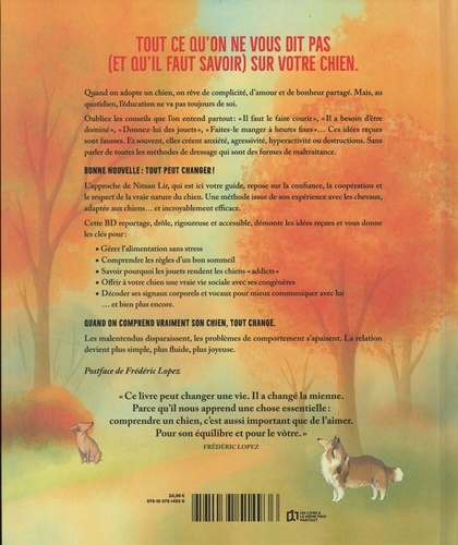 Tout ce qu'on ne vous dit pas (et qu'il faut savoir) sur votre chien. Quand on adopte un chien, on rêve de complicité, d'amour et de bonheur partagé. Mais, au quotidien, l'éducation ne va pas toujours de soi. Oubliez les conseils que l'on entend partout : " Il faut le faire courir ", " Il a besoin d'être dominé ", " Donnez-lui des jouets ", " Faites-le manger à heures fixes "... Ces idées reçues sont fausses. Et souvent, elles créent anxiété, agressivité, hyperactivité ou destructions. Sans parler de toutes les méthodes de dressage qui sont des formes de maltraitance. Bonne nouvelle : tout peut changer ! L'approche de Nitsan Lir, qui est ici votre guide, repose sur la confiance, la coopération et le respect de la vraie nature du chien. Une méthode issue de son expérience avec les chevaux, adaptée aux chiens... et incroyablement efficace. Cette BD reportage, drôle, rigoureuse et accessible, démonte les idées reçues et vous donne les clés pour : Gérer l'alimentation sans stress Comprendre les règles d'un bon sommeil Savoir pourquoi les jouets rendent les chiens " addicts " Offrir à votre chien une vraie vie sociale avec ses congénères Décoder ses signaux corporels et vocaux pour mieux communiquer avec lui ... et bien plus encore. Quand on comprend vraiment son chien, tout change. Les malentendus disparaissent, les problèmes de comportement s'apaisent. La relation devient plus simple, plus fluide, plus joyeuse. Postface de Frédéric Lopez " Ce livre peut changer une vie. Il a changé la mienne. Parce qu'il nous apprend une chose essentielle : comprendre un chien, c'est aussi important que de l'aimer. Pour son équilibre et pour le vôtre. " - ; Frédéric Lopez