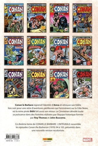 Conan le Barbare et Bêlit font équipe contre les bêtes d'Ajaga. Découvrez également des créatures aussi fascinantes que le lion noir, d'inquiétants hommes-crabes, des vampires ou une sirène mortelle ! Le long épisode 100 de la série voit la vie de Conan changer radicalement. Un nouveau volume de la série Conan the Barbarian, publiée par Marvel de 1970 à 1993. La longue prestation de Roy Thomas et John Buscema est reconnue comme l'une des plus définitives sur le personnage du Cimmérien. Cette période de la série n'avait jamais été republiée en France depuis les revues kiosques des années 80.