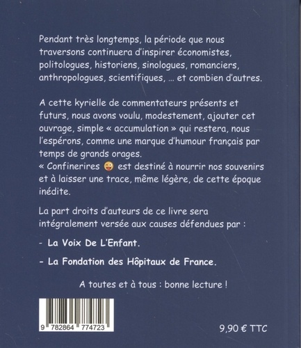 Pendant très longtemps, la période que nous traversons continuera d'inspirer économistes, politologues, historiens, sinologues, romanciers, anthropologues, scientifiques, ... et combien d'autres. A cette kyrielle de commentateurs présents et futurs, nous avons voulu, modestement, ajouter cet ouvrage, simple "accumulation" qui restera, nous l'espérons, comme une marque d'humour français par temps de grands orages. Confinerires est destiné à nourrir nos souvenirs et à laisser une trace, même légère, de cette époque inédite.
